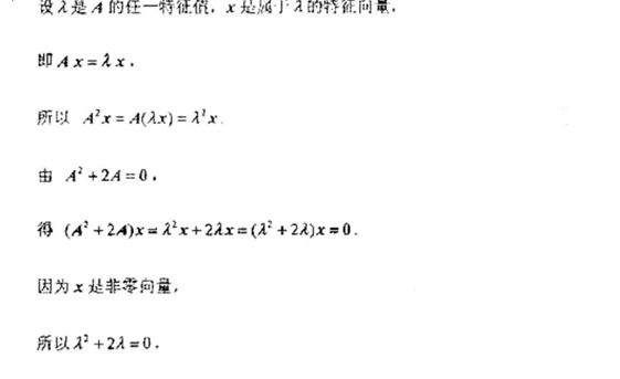 已知A是n阶矩阵,且满足方程A2+2A=0,证明A的特征值只能是0或-2。 作者:高老师 时间:2024-07-29 浏览 0 已知A是n阶矩阵,且满足方程A2+2A=0,证明A的特征值只能是0或-2。【正确答案】:则λ=0或λ=-2【题目解析】:则λ=0或λ=-2 📱 扫码体验刷题小程序 扫一扫使用我们的微信小程序