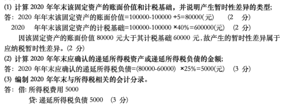 2019年12月30日,甲公司购入成本100000元的生产设备一台,当日即投入使用,预计使用年限5年,预计净残值为0,会计采用年 作者:高老师 时间:2024-07-29 浏览 2 2019年12月30日,甲公司购入成本100000元的生产设备一台,当日即投入使用,预计使用年限5年,预计净残值为0,会计采用年限平均法计提折旧,2020年年末该生产设备未发生减值。税法规定采用双倍余额递减法计提折旧,假设税法规定的使用年限、净残值与会计规定相同,甲公司适用的所得税税率为25%,不考虑其他因素。要求: (1)计算2020年年末该固定资产的账面价值和计税基础,并说明产生暂时性差异的类型;(2)计算2020年年末应确认的递延所得税资产或递延所得税负债的金额;(3)编制2020年年末与所得税相关的会计分录。【正确答案】: 📱 扫码体验刷题小程序 扫一扫使用我们的微信小程序