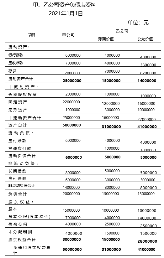 甲、乙公司不存在关联关系,2021年1月1日,甲公司发行面值1元、公允价值3.5元的普通股10000000股对乙公司进行吸收合并。甲公司支付与发行股票相关佣金及手续费300000元,支付与合并相关的审计、评估等费用共400000元。合并前甲、乙公司资产负债表资料如下表所示。