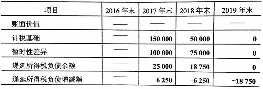 【题目解析】:2017年末:该固定资产计税基础=300000-500000*3/(1+2+3+4)=150000元,暂时性差异=250000-150000=100000元,资产的账面价值大于计税基础,该差异是应纳税暂时性差异,形成递延所得税负债=100000*25%=25000元,与2016年相比:25000-18750=6250元。2018年末:该固定资产计税基础=150000-500000*2/(1+2+3+4)=50000元,暂时性差异=125000-50000=75000元,资产的账面价值大于计税基础,该差异是应纳税暂时性差异,形成递延所得税负债=75000*25%=18750元,与2017年相比:18750-25000=-6250元。2019年末:由于该固定资产无残值,所以在2019年末,账面价值=计税基础=0(全部折完),递延所得税负债与2018年相比:0-18750=-18750元。