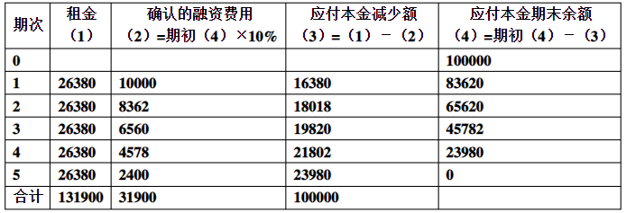(1)设备的公允价值=105000(元);最低租赁付款额=26380×5=131900(元);最低租赁付款额的现值=26380×PVIFA10%,5=26380×3.79075=100000。由于租赁开始日,最低租赁付款的现值低于设备的公允价值,故应以最低租赁付款额的现值作为租入设备的入账价值。