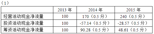 (1)根据上述资料,以2013年为基年,进行现金流量的定比趋势分析,请将下表绘制答题卡上并填写空格。