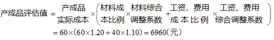 某企业产成品实有数量为100台,每台实际成本60元,根据会计核算资料,生产该产品的材料费用与工资等费用的比例为60:40,根据目 作者:高老师 时间:2024-07-29 浏览 0 某企业产成品实有数量为100台,每台实际成本60元,根据会计核算资料,生产该产品的材料费用与工资等费用的比例为60:40,根据目前价格变动情况和其他相关资料,确定材料综合调整系数为1.20,工资等费用综合调整系数为1.1O。该产成品的评估值为( )A、6600元B、6960元C、7200元D、13560元【正确答案】:B【题目解析】: 📱 扫码体验刷题小程序 扫一扫使用我们的微信小程序