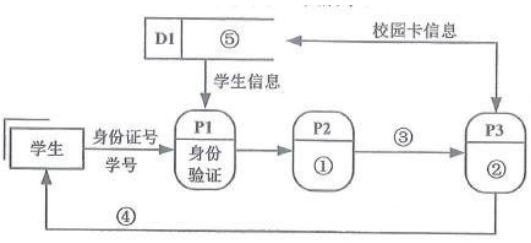 学生校园卡挂失与重新办理的流程如下:学生输入身份证号和学号,系统进行身份验证后,执行挂失处理,将该学生的校园卡冻结。校园卡挂失后,根据学生的身份证号和学号办理新卡,更新学生校园卡的相关信息,最后将新制作好的校园卡提供给学生。上述业务处理的数据流程图如题42图所示。