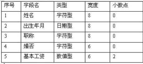 在Visual FoxPro中,使用表设计器创建“职工人事档案”数据表的结构(如题42表所示)。(字段的宽度以题42表为准,不考虑预留宽度。) 姓名 出生年月 职称 婚否 基本工资 朱晴天 07/12/70 主任医师 .F. 1024.35 刘家晔 11/09/54 工程师 .T. 8965.57 沈书毅 09/11/52 经济师 .T. 1024.19 欧阳泽新 12/07/69 助工 .F. 576.35 题42表 请将表设计器的设置结果填写在下表中,不需要设定的项目请用“×”表示 序号 字段名 类型 宽度 小数位 1 姓名 2 出生年月 3 职称 4 婚否 5 基本工资