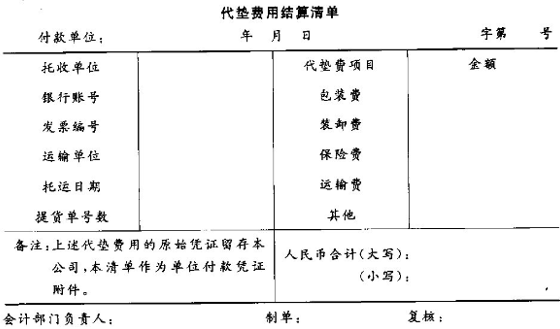 代垫费用结算清单至少一式两份,一份与发票一并交开户银行向购货单位收款;一份留存会计部门归档保管。缺少内容是购货单位名称、应付代垫费用的大小写金额、编制清单日期、凭证编号。