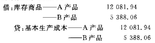 (2)计算A、B产品成本:A产品完工产品成本=2200+10000+1800+252+1229.94-3400=12081.94(元)A产品在产品成本=3400(元)B产品完工产品成本=3200+1200+168+820.06=5388.06(元)结转完工产品成本: