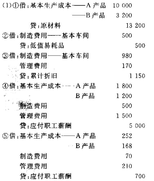 某企业采用品种法计算产品成本。该企业生产A、B两种产品,月末在产品成本只包括原材料价值,不分摊工人工资和其他费用。A、B两种产品的共同费用按工人工资的比例分配。该企业2010年9月初A产品的在产品实际成本为2200元,B产品无在产品。9月末,A产品在产品应负担的原材料为3400元,B产品全部完工。9月份发生下列经济业务:(1)基本生产车间领用原材料,实际成本为13200元,其中,A产品耗用10000元,B产品耗用3200元。(2)基本生产车间领用低值易耗品,实际成本500元,该企业低值易耗品采用一次摊销法摊销。(3)计算提取固定资产折旧费115O元,其中车间折旧费980元,厂部管理部门折旧费170元。(4)应付职工工资5000元,其中,生产工人工资3000元(生产A产品工人的工资为1800元,生产B产品工人的工资为1200元),车间管理人员工资500元,厂部管理人员工资1500元。(5)提取其他职工薪酬费用700元,其中,生产工人其他职工薪酬费用为420元(A产品为252元,B产品为168元),车间管理人员其他职工薪酬费用70元,厂部管理人员其他职工薪酬费用210元。(6)分配间接费用。[要求](1)根据上述经济业务,编制会计分录。(2)计算A、B两种产品总成本及A产品在产品成本;结转完工产品成本。