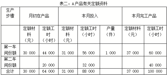 某企业生产A产品经过两个步骤生产,分别在第一车间、第二车间连续加工完成,第一车间为第二车间提供半成品,第二车间将半成品加工成产成品。原材料生产开始时一次投入,完工产品与期末在产品之间分配费用采用定额比例法。有关A产品月初在产品成本和本月发生的费用资料如表一所示,A产品的定额资料如表二所示。该企业采取平行结转分步法计算A产品成本。