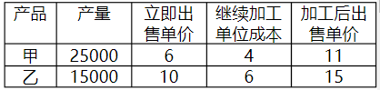 【正确答案】:甲产品进一步加工的预期收入增加额=25 000 x ( 11 -6) = 125 000 ;甲产品进一步加工预期成本=25 000 x 4 = 100 000 ;甲产品加工后的差量收入大于差量成本 ,应进一步加工。 乙产品进一步加工的预期收入=15 000 × ( 15 -10 ) = 75 000 ;乙产品进一步加工预期成本=15 000 x 6 = 90 000 ;乙产品加工后的差量收入小于差量成本 ,应立即出售。