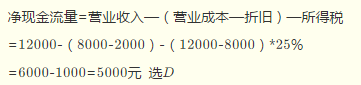 某投资方案的年营业收入为12,000元,年总营业成本为8,000元,其中年折旧额2,000元,所得税率为25%,则该方案的每年营 作者:高老师 时间:2024-07-30 浏览 0 某投资方案的年营业收入为12,000元,年总营业成本为8,000元,其中年折旧额2,000元,所得税率为25%,则该方案的每年营业净现金流量为( )。A、3000元B、3500元C、4500元D、5000元【正确答案】:D【题目解析】: 📱 扫码体验刷题小程序 扫一扫使用我们的微信小程序