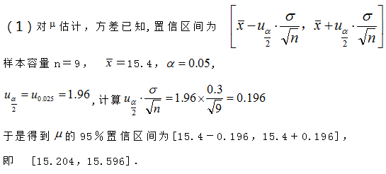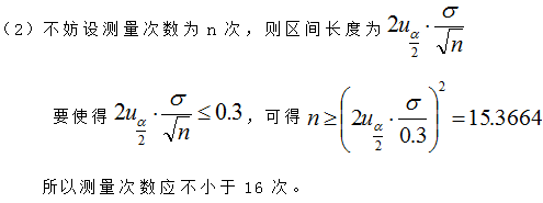 = 15.4(g) .己知测量数据 X~N(μ, 0.32 )(单位:g). (1)求该物体质量的置信度为 0.95的置信区间 (2)为了使置信度为0.95的置信区间的长度不超过 0.3,需调整测量次数,问测量次数 n应不小于多少? (附:U0.025 =1.96 )
