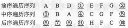 已知二叉树T中含有元素 A,B,C,D,E,F,G,H,T的前序遍历序列、中序遍历序列和后序遍历序列如下,其中符号__ __表示未知元素. 试写出①到⑩所代表的正确元素值.