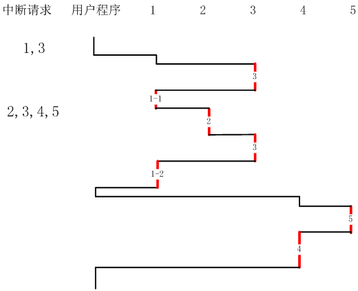 现要求其实际的中断处理次序为2→3→1→5→4,设置中断级屏蔽位如下表(1表示对该中断屏蔽)设置方法:中断处理次序最低为4,那么在所有中断级上,对应4级这一列都设置屏蔽,即“4级”这一列,都是1;次序次低的5,那么在中断级上,除了比它低的第4级对应“5级”这一列的项为0,表示不屏蔽,其他都是1;依次得到下表所有值。