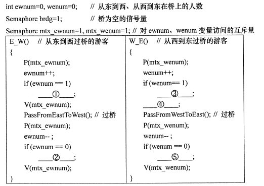 一座东西走向的独木桥横亘河上,河的两边都有游客要过桥,按照下面的规则过桥:同一方向的游客可连续过桥,某方向有游客过桥时另一方向的游客要等待。桥无比坚固,可承受的人数不限。以下算法用信号量机制描述了这些进程的同步关系。请补充题目中的P、V操作,将编号①~⑤处空缺的内容填写在答题纸上。其中信号量以及其他变量定义如下: