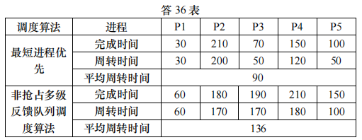 有5个进程P1,P2,P3,P4,P5,它们的到达时间和服务时间分别为P1(0,30),P2(10,60),P3(20,40),P4(30,50),P5(50,30),忽略I/O以及其它开销时间,若分别采用最短进程优先算法、非抢占式多级反馈队列调度算法(进程最初进入第1级,执行完一个时间片后进入第2级,以此类推,第i级队列的时间片为10*i)。请计算各进程的完成时间、周转时间、平均周转时间、(四舍五入,保留一位小数),在答题纸上列表作答。