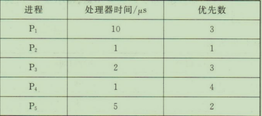 有5个进程P₁、P₂、P₃、P4、P5,它们同时依次进入就绪队列,它们的优先数和需要的处理器时间如下表所示。
