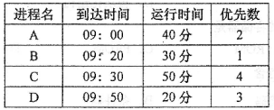 有四个进程A、B、C、D,它们到达内存时间、运行时间和优先数如下表所示,优先数越小,优先级越高,进程调度采用抢占式最高优先级算法。切换时间不计。