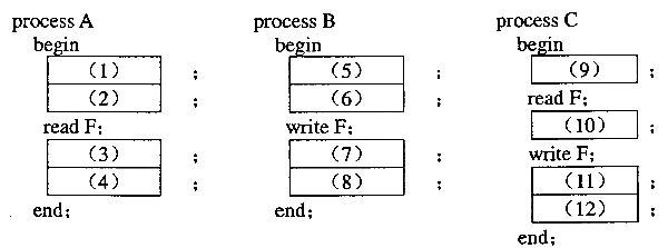 有三个进程A,B,C共享一个文件F。进程A对F只读不写,进程B对F只写不读,进程C对F先读后写。规定多个进程可同时读,但有进程在读时不允许其它进程写,有进程在写时不允许其它进程读或写。当用PV操作管理时,回答下列问题: