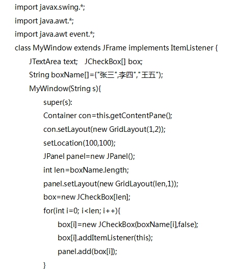 以下MyWindow类根据给定的选择项目表构造一组复选按钮,当某个复选按钮的选择状态有改变(从选中变成未选中,或从未选中变成选中)时,复选按钮的侦听程序将在右边文本区中输出所有选择项目的状态。