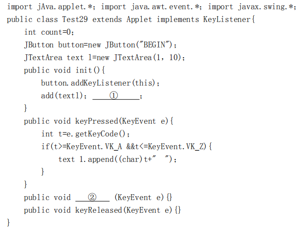 某小应用程序有一个按钮和一个文本区,按钮作为发生键盘事件的事件源,并对它进行监视。程序运行时,先点击按钮,让按钮激活;从键盘输入 作者:高老师 时间:2024-08-04 浏览 1 某小应用程序有一个按钮和一个文本区,按钮作为发生键盘事件的事件源,并对它进行监视。程序运行时,先点击按钮,让按钮激活;从键盘输入英文字母时,在文本区显示输入的字母。【正确答案】:add(button)keyTyped 📱 扫码体验刷题小程序 扫一扫使用我们的微信小程序