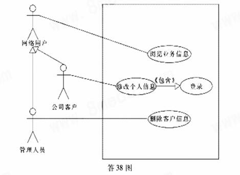 该系统的用况图如答38图.其所包含的元素如下:(1)参与者:网络用户、公司客户、管理人员;(2)用况:浏览业务信息;(3)用况:登录;(4)用况:修改个人信息;(5)用况:删除客户信息.
