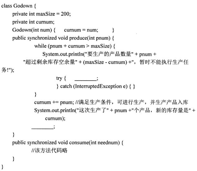 以下定义的类Godown用于管理多个线程共享产品库存量数据。类定义了让生产者线程和消费者线程共享的两个操作:生产produce(int pnum)和消费consume(int neednum)。限制生产操作和消费操作不能同时进行,也不能因生产(进库)让库存超过最大库存量maxSize,消费(出库)不能大于当前库存量curnum。为了保证生产和消费操作的完整和正确,这两个操作有互斥和同步要求。以下是管理产品库存量curnum的类Godown的代码,其中消费方法consume()没有在以下代码中列出。