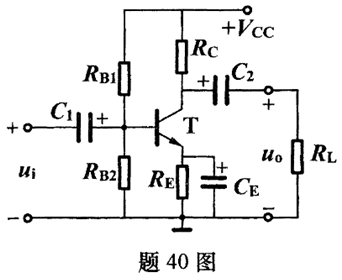 放大电路如题40图所示,已知晶体管T的β=50,UBE=0.6v,rbe=1.65KΩ,VCC=12V,RB1 =51 KΩ, RB2 =9 KΩ, RC =8KΩ, RE =2 KΩ, RL =3 KΩ,设各电容的容量足够大。 要求: (1)用估算法求静态工作点IBQ, ICQ , UCEQ ; (2)画出微变等效电路; (3)计算放大电路的输λ电阻Ri和输出电阻RO; (4)计算放大电路的电压放大倍数Au;