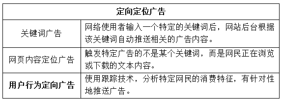 使用跟踪技术,记录网民日常使用网络的信息,进而分析特定网民的消费特征,有针对性地推送广告。属于( )