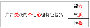 广告受众的个性心理特征包括能力、( )、性格。 作者:高老师 时间:2024-08-06 浏览 0 广告受众的个性心理特征包括能力、( )、性格。 【正确答案】:气质【题目解析】:助记:收个信,励志哥——收(受)个信(心),励(力)志(质)哥(格)。 📱 扫码体验刷题小程序 扫一扫使用我们的微信小程序