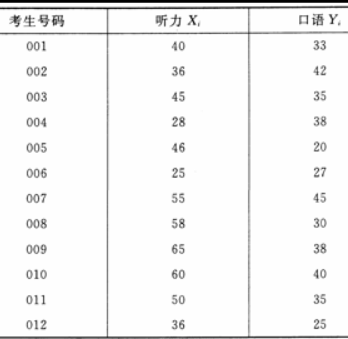 有12名考生报考日语专业,参加了由某外语学院举行的日语听力测试和口语能力面试。日语听力测试采用较规范的设备和测试材料,而口语能力面试主要采用交谈方式进行综合评估,其分数的精确度稍差些。这1 2名学生的两项成绩见下表,试分析这两种能力分类之间的连带关系,用哪种方法合适?