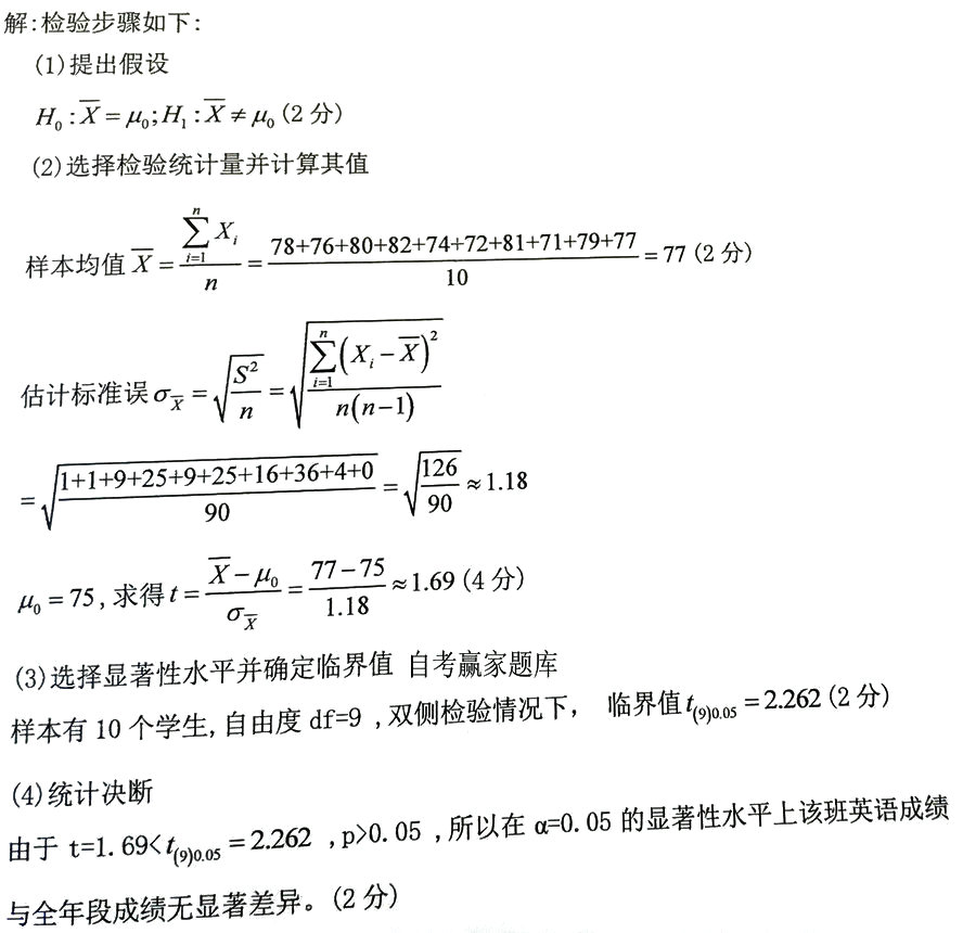 某中学初二学生英语测试成绩呈正态分布,平均分为75分,该年段某班10个学生的分数分别为78,76,80,82,74,72,81, 作者:高老师 时间:2024-08-06 浏览 0 某中学初二学生英语测试成绩呈正态分布,平均分为75分,该年段某班10个学生的分数分别为78,76,80,82,74,72,81,71,79,77。在这个样本的基础上,请在=0.05的显著性水平上检验该班英语成绩与全年段是否一致?(双侧检验情况下,t(9)0.05=2.262,t(10)0.05=2.228,计算结果保留两位小数)【正确答案】: 📱 扫码体验刷题小程序 扫一扫使用我们的微信小程序