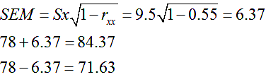 假设某岗位培训结业考试的测验信度系数rxx=0.55,标准差S=9.5,试求该结业考试的测量标准误。某考生成绩78分,其真分数值 作者:高老师 时间:2024-08-06 浏览 0 假设某岗位培训结业考试的测验信度系数rxx=0.55,标准差S=9.5,试求该结业考试的测量标准误。某考生成绩78分,其真分数值的区间是多少?(保留两位小数)【正确答案】:真分数值的区间是71.63~84.37 📱 扫码体验刷题小程序 扫一扫使用我们的微信小程序