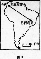 图3是南美洲略图,若欲由哥伦比亚首都圣菲波哥大搭秉飞机飞往巴西首都巴西利亚,据此回答{TSE}题。