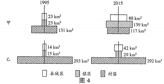 【题目解析】:本题考查城市化。由图4可知,2015年甲县村落面积小于乙县,但甲县的镇区、县城区面积大于乙县。