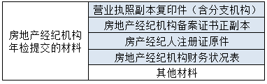 本题可从“提交的材料”入手。房地产经纪机构年检除填写年检申报表外,还需提供下列材料: