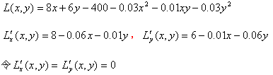 某工厂生产两种产品I和II,销售单价分别为10元与9元,生产x件产品I与生产y件产品II的总费用为C=400+2x+3y+0.0 作者:高老师 时间:2024-07-20 浏览 2 某工厂生产两种产品I和II,销售单价分别为10元与9元,生产x件产品I与生产y件产品II的总费用为C=400+2x+3y+0.01(3x2+xy+3y2)(元).问两种产品的产量各为多少时,才能使总利润最大?【正确答案】:利润函数L(x,y)=10x+9y-[400+2x+3y+0.01(3x2+xy+3y2)]有x=120,y=80。所以当生产120件产品I及80件产品II能使总利润最大。 📱 扫码体验刷题小程序 扫一扫使用我们的微信小程序