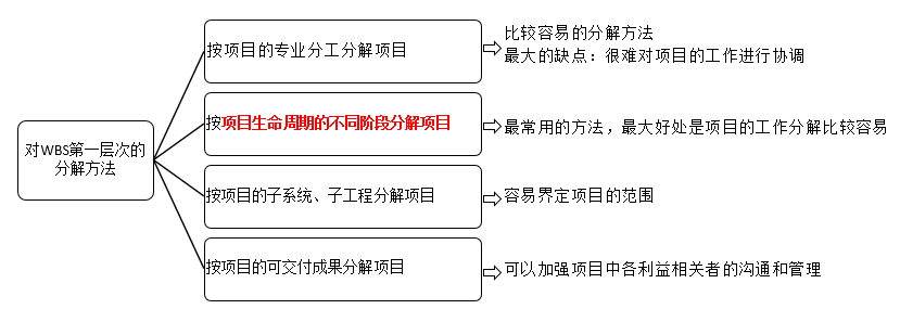 按照项目生命周期的不同阶段分解项目是最常用的方法,好处在于项目的工作分解比较容易,只要按照阶段划分就可以
