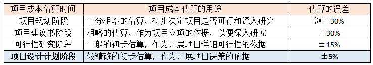 本题破题点:“项目设计计划阶段”,关键在于区分成本估算各个阶段的误差,如下表: