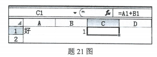 在Excel2010中,如题21图所示,若C1单元格公式为:=A1+B1,则C1单元格显示的是 作者:高老师 时间:2024-07-21 浏览 2 在Excel2010中,如题21图所示,若C1单元格公式为:=A1+B1,则C1单元格显示的是A、####B、#DIV/0!C、#N/AD、#VALUE!【正确答案】:D 📱 扫码体验刷题小程序 扫一扫使用我们的微信小程序