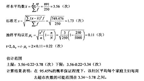 某社区共有5000户居民,用不重置抽样方法随机抽取了250户,调查其家庭主妇每周到附近超市购物的次数,调查资料整理如下: