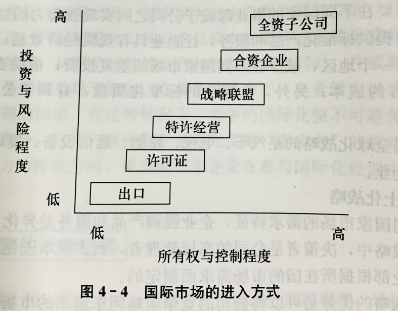 在进入国际市场的方式中,全资子公司一般是费用和风险最高的方式。对于特许经营、合资企业或战略联盟而言,他们的风险是与合作者共同承担的;而对于全资子公司,全部风险都有母公司承担。