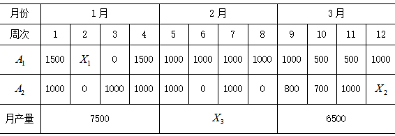 甲公司根据综合生产计划的安排,明年第一季度计划生产A系列产品20000台。A系列共A1、A2两个品种,公司现已安排了明年第一季度部分主生产计划(如下表)。请安排其余主生产计划,即求出下表中X1、X2、X3的值。