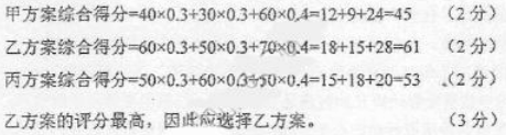 某公司计划开发一种新产品,共提出甲乙丙三套开发方案。公司从投资可行性、技术可 行性、市场可行性三个方面对方案进行综合评价。各项评价因素的权重分别设定为 0.3、0.3、O。4,并请有关专家对三个开发方案进行评分;各项因素的权重和评分平均值见下表: