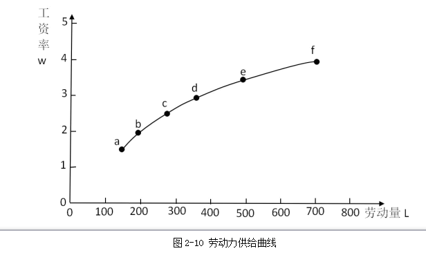 本题属于识记类,考生需牢记。根据劳动力供给表画出的劳动力供给曲线是从左下向右上倾斜的曲线。应当说明的是,供给曲线是一条平滑的曲线而不是一条折线,原因是假定工资率和供给量无限可分。