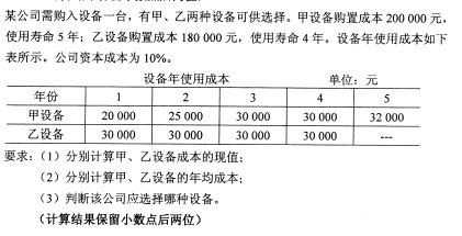 作者:高老师 时间:2024-07-22 浏览 1 【正确答案】:(1)甲设备成本的现值=200000+20000×0.9091+25000×0.8264+30000×0.7513+30000×0.6830+32000×0.6209=301739.8(元)(2)甲设备年均成本=301739.8/3.7908=79597.92(元)乙设备年均成本=275097/3.1699=86784.13(元)(3)根据计算结果,应选择甲设备。 📱 扫码体验刷题小程序 扫一扫使用我们的微信小程序