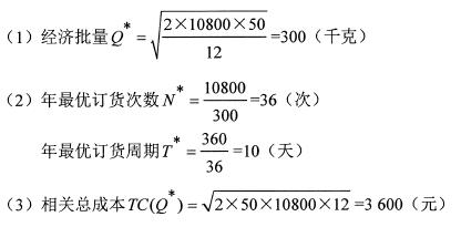 某公司生产需要外购甲材料,该材料的年需求量为10 800千克,预计每次订货费用 为50元,单位存货年储存成本为12元。一年按36 作者:高老师 时间:2024-07-22 浏览 0 某公司生产需要外购甲材料,该材料的年需求量为10 800千克,预计每次订货费用 为50元,单位存货年储存成本为12元。一年按360天计算。 要求: (1)计算采购甲材料的经济批量; (2)计算年最优订货次数和订货周期; (3)计算经济批量下的存货相关总成本。 【正确答案】: 📱 扫码体验刷题小程序 扫一扫使用我们的微信小程序